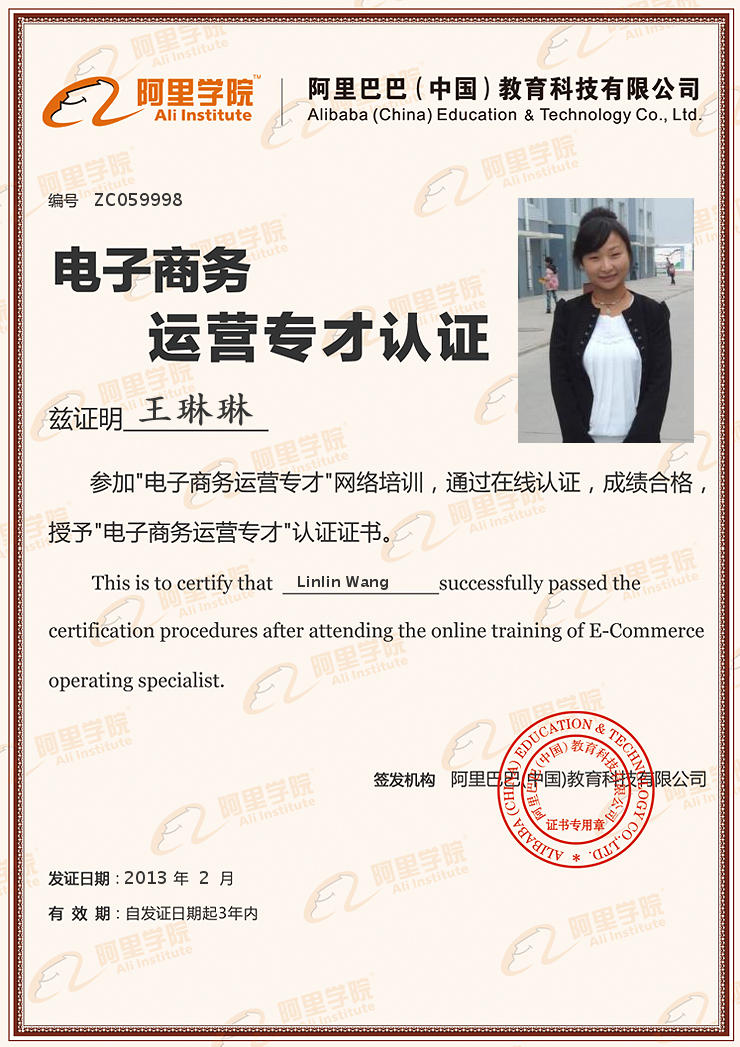 2009年12月18日 獲得“阿里巴巴國(guó)內(nèi)貿(mào)易應(yīng)用專(zhuān)員”證書(shū)2010-2011 年從事阿里巴巴商務(wù)主管